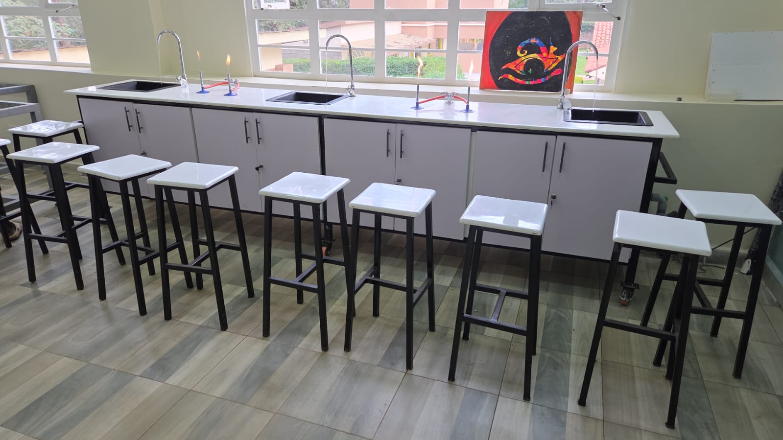 3.6m x 0.6m, 10 Laboratory stools, 13kg cylinder gas,water and gas taps,storage cabinets.